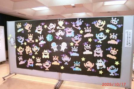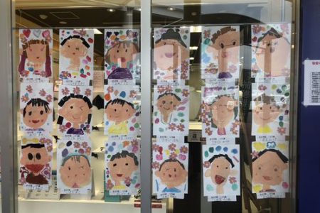 うめ組園児が描いたおじいちゃん、おばあちゃんの似顔絵が展示されました