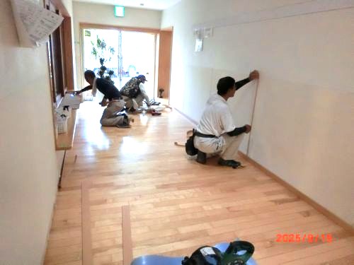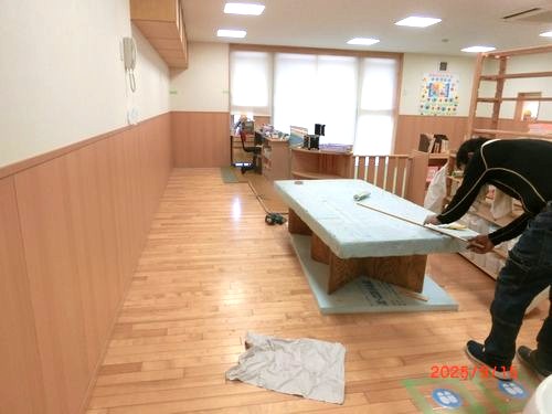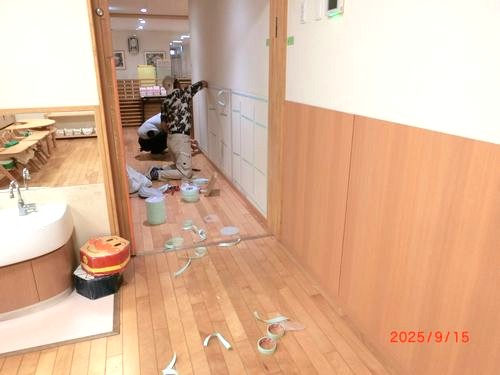 日々の保育により、園舎内の壁面のクロスに剥がれや汚れが目立つようになってきたため、昨日(9/15)、壁面下部に腰壁板を設置する改修工事を行いました。