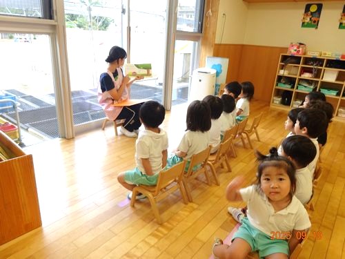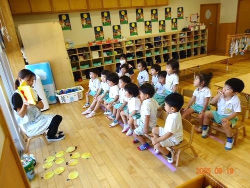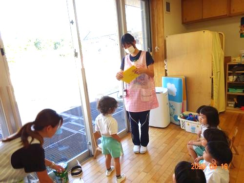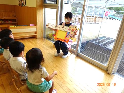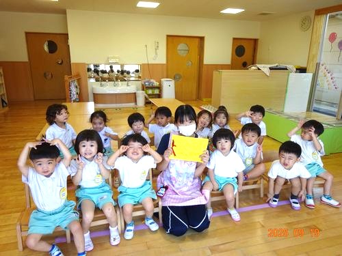 先日(9/19)、こども園のひまわり組(2歳児)で保育実習を行っていた学生の実習生さんが約1か月の実習を無事に終えられました。
