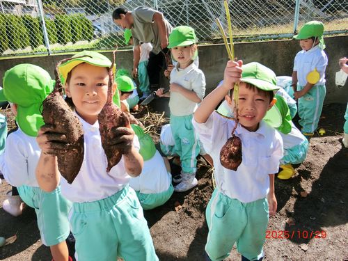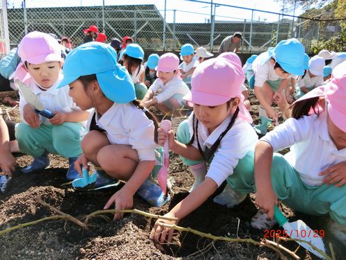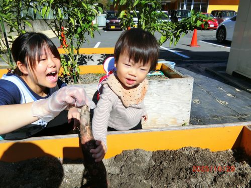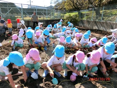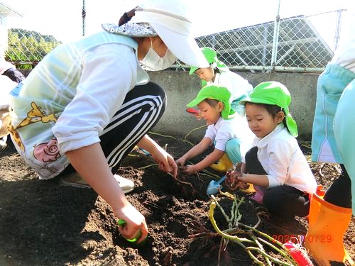 本日(10/29)、こども園の菜園で、こども園と乳児保育園の全園児がさつまいものいもほりをしました。