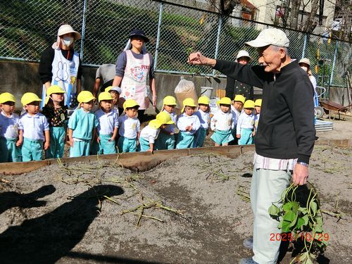 元園長の高橋先生から「5月に植えたさつまいもの苗がお日さんパワーや雨パワー、大きくなあれというお祈りパワーでスクスク育ちました。がんばっておいもほりをしましょう」とのお話しを聞いて、いもほりスタート!