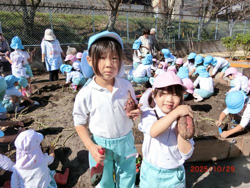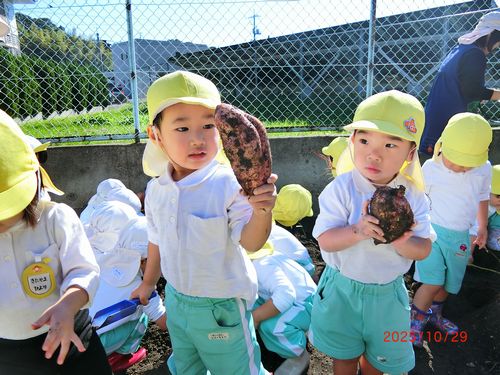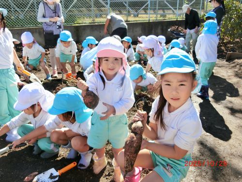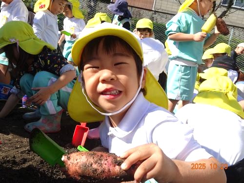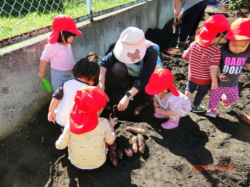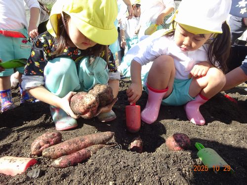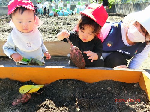 また、0歳児と1歳児の園児は、いもほりごっこをしました。スコップや手で土を掘り、採れたさつまいもを嬉しそうに見せてくれました。