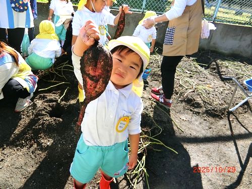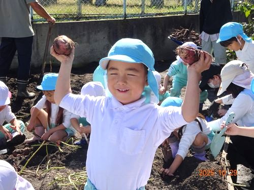 そして、夢中になっていもほりを楽しんでいた園児たち。スコップで土を掘りながらさつまいもの頭が少し見えると、なかよし兄弟やお友だちと協力しながら収穫することができました。手でさつまいもの形を表しながら、「こんなのあった!」と嬉しそうな様子が見られ、焼きいもパーティーのことを伝えると「食べたい!」と、今から楽しみにしている園児もいました。