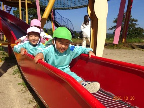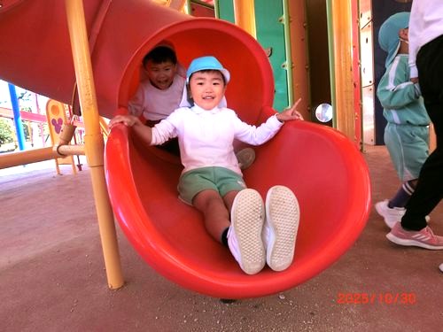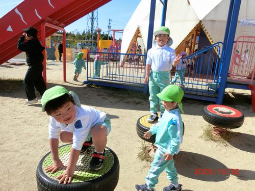 そして、朝からとっても楽しみにしていたお弁当!「こんなの作ってもらった!」「大好きな唐揚げ!!」とすごく嬉しそうで、おいしく頂く園児たちでした。その後、こども園にはない大きな複合遊具で楽しく遊びました!