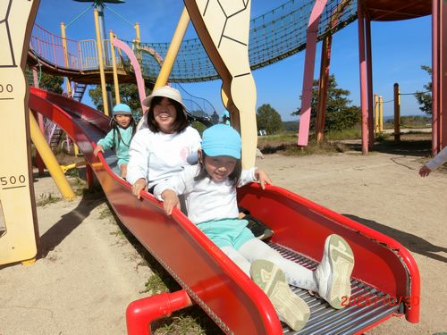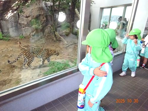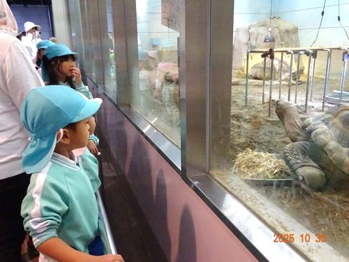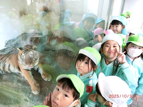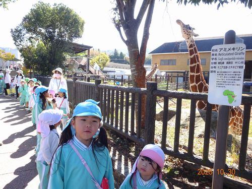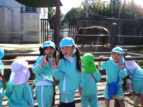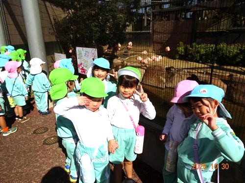 昨日(10/30)、さわやかな秋晴れ中、こども園の3~5歳児の園児たちが、福山市立動物園に秋のバス遠足に行きました。