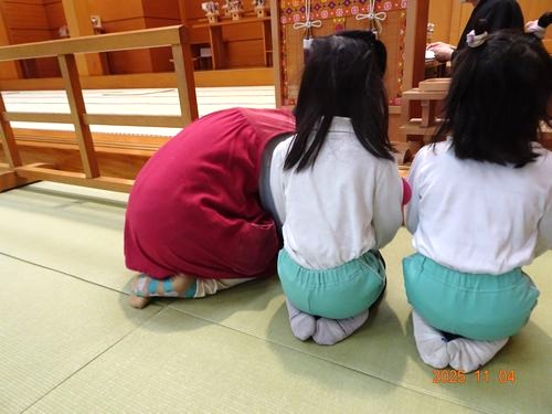 10月に元気に過ごせたお礼と、11月も交通事故などにあわず、元気に過ごせるようにとお願いをさせていただきました。また、うめ組(5歳児)のお当番の園児は、園長先生と一緒に、本部広前会堂のお広前で、金光様にお礼とお願いのお届けをさせていただきました。