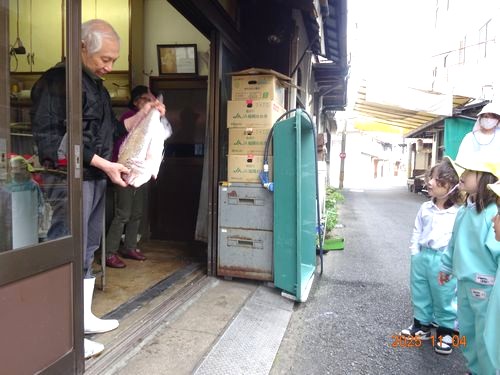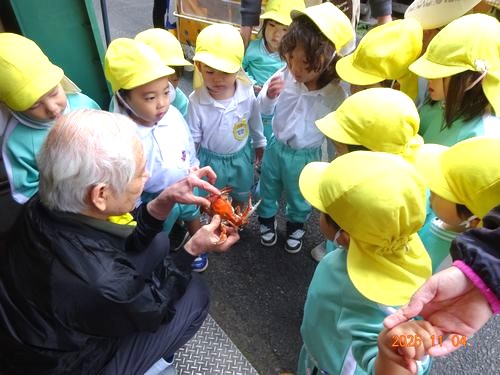 お参りの後、こども園のたんぽぽ組(0歳児)とひまわり組(2歳児)の園児たちは、大谷の街中をお散歩をしました。魚屋さんでは、に着くと、「お魚見せて!」とカニや鯛などの魚を見せてもらいました。