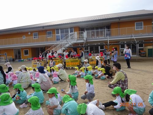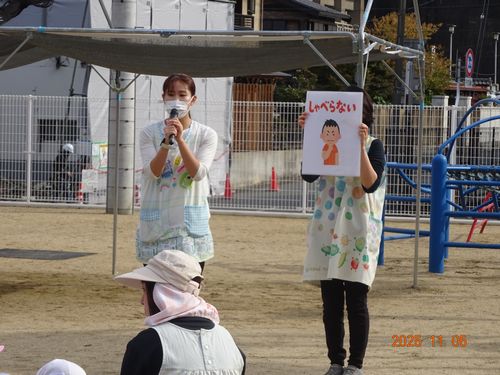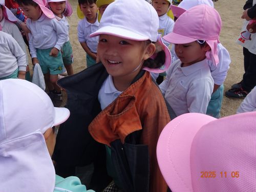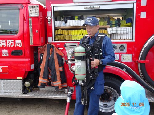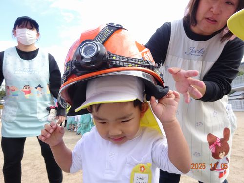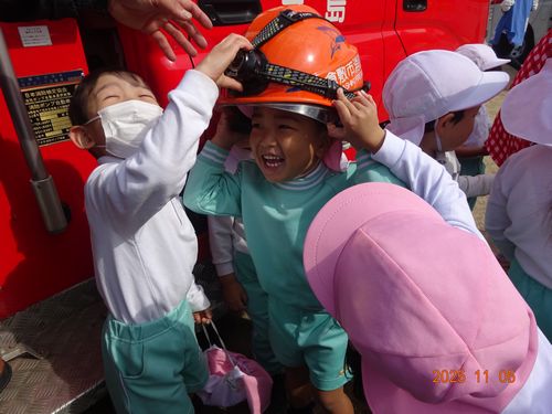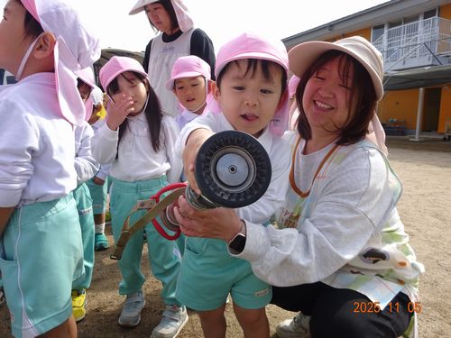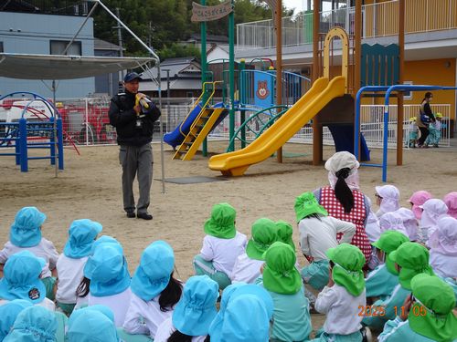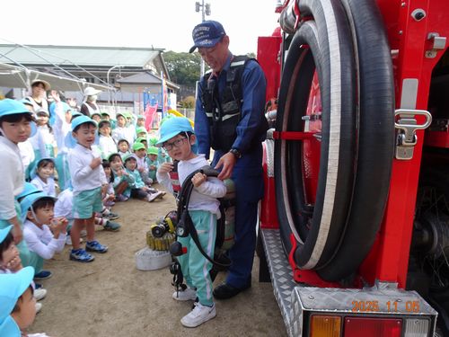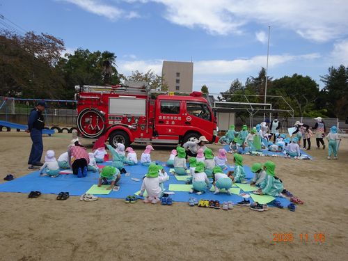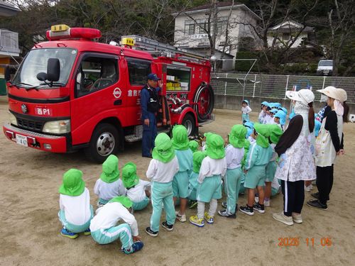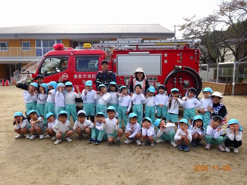 昨日(11/5)、玉島消防署西出張所の方々お越しいただき、こども園と乳児保育園の園児たちが火災予防の会に参加しました。