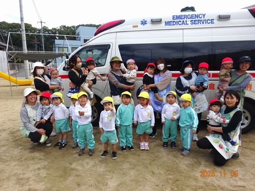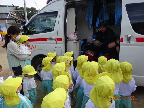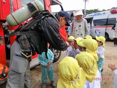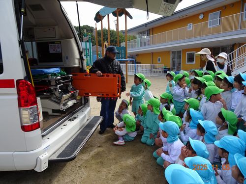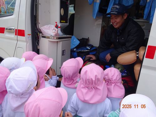訓練後には、消防車や救急車と写真を撮ったり、車内や装備を見せてもらったりと楽しい時間を過ごしました。消防車ではホースの使い方について説明してもらったり、救急車ではAEDのお話しを聞きました。園児たちは、興味津々でお話しを聞いて、見学をしていました。