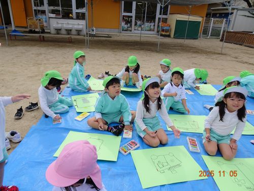さらに、3~5歳児の園児たちは、園庭で消防車と救急車の絵を描きました。消防士さんや先生に声をかけてもらいながら、一生懸命クレパスを握って描く姿がありました。