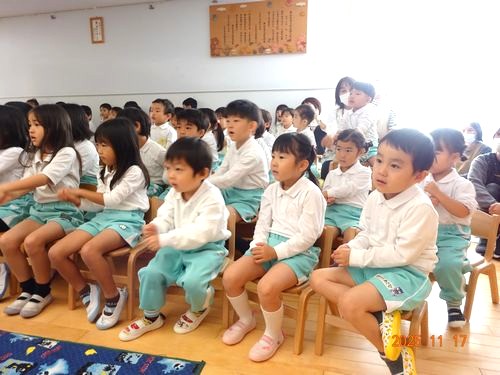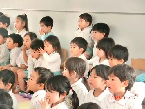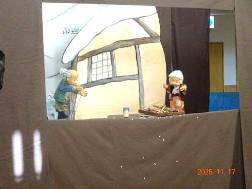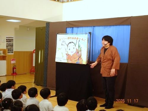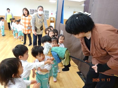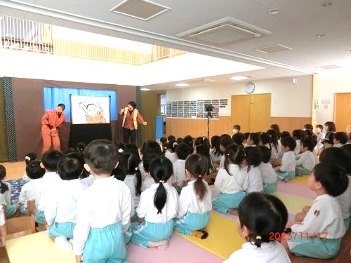 本日(11/17)、こども園の遊戯室でこども園と乳児保育園の2歳児以上の園児たちが人形劇を鑑賞しました。