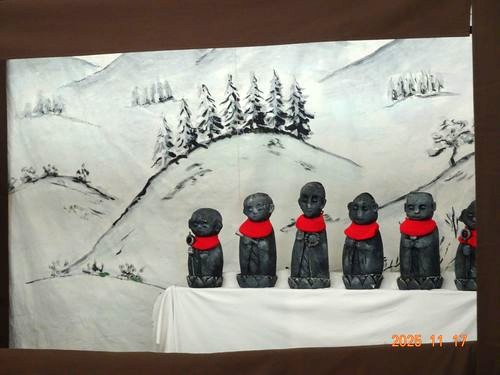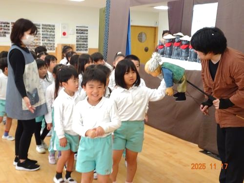 劇団すぎのこさんが来園され、紙芝居『ふぅぅ〜ぼわぁぁぁーん!』と人形劇『かさじぞう』を見せてくださいました。人形劇では、餅つきの歌に合わせて手遊びをしたり歌を歌ったりし、話の中に園児たちも入り込んで楽しむ姿がありました。また、劇団の方2名で登場人物の役や、場面変化の小道具等の出し入れもされており、「本当に2人しかいなかったのかな?」と不思議に思う園児もいました。