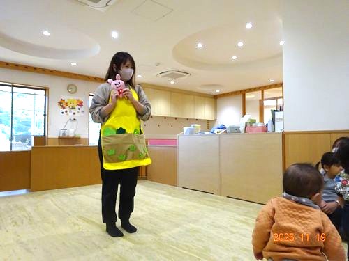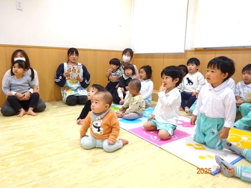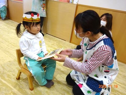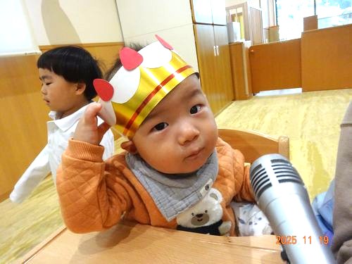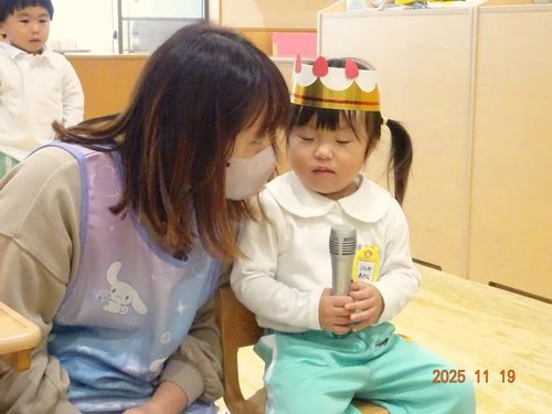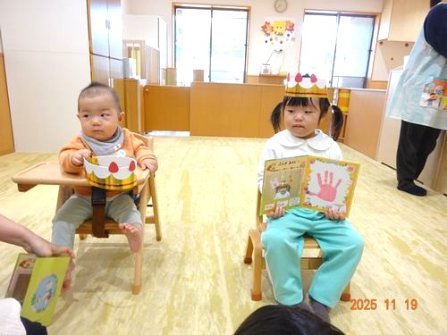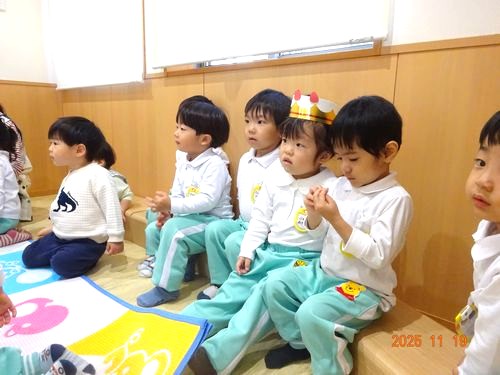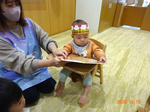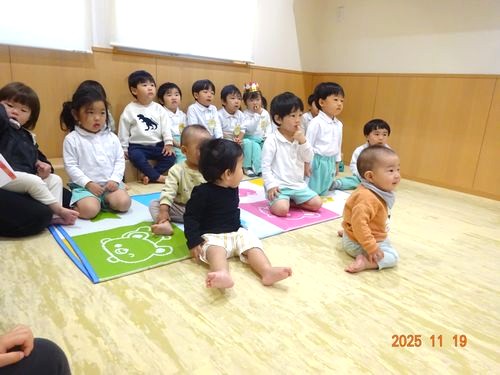 本日(11/18)、乳児保育園の保育室で、 10月の誕生会に欠席したお友だちと、11月生まれのお友だちをお祝いをする誕生会を行いました。