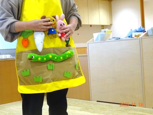 誕生月のお友だちは、インタビューをされると照れたような様子でしたが、「好きな食べ物は何ですか?」の質問には「ぶどう」と教えてくれました。そして、隣のお友だちと手をつないで歌でお祝いをしました。お楽しみのコーナーでは、先生による「やさい畑」のエプロンシアターを見ました。園児たちは、知っている動物や野菜が出ると、口々に答えて、盛り上がっていました。