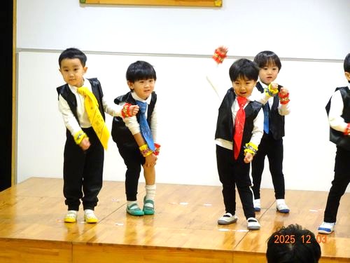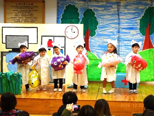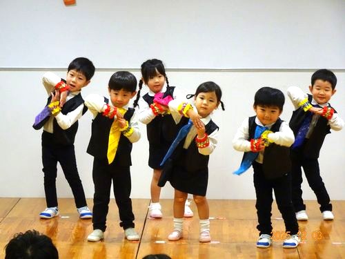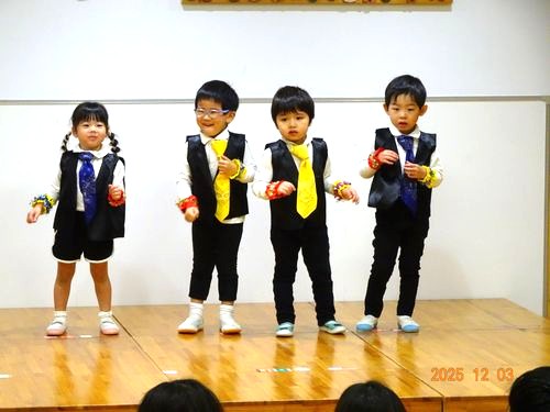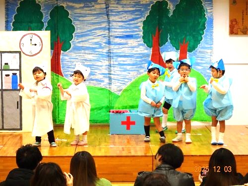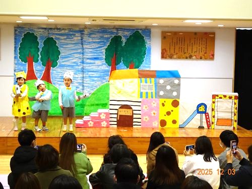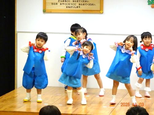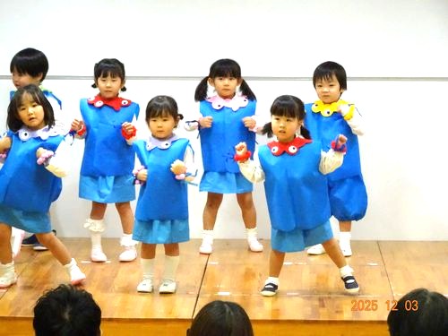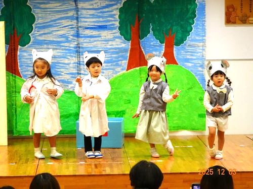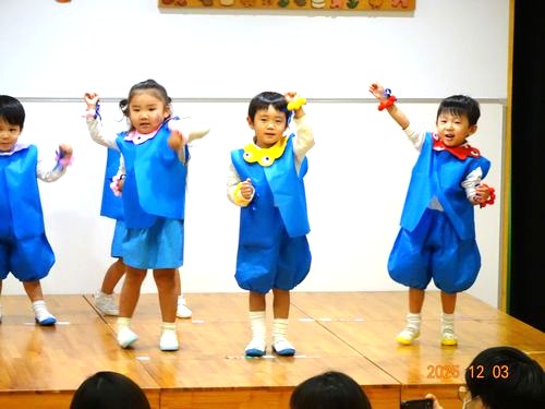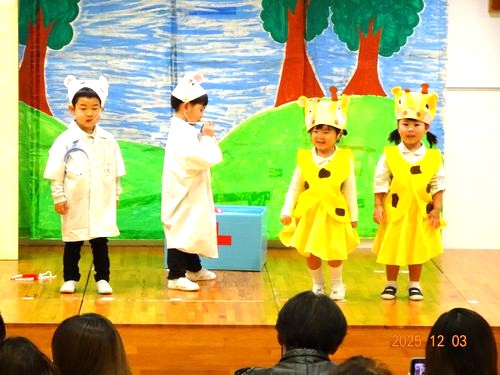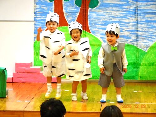 0~満3歳児の園児たちの発表に続き、もも1組ともも2組(3歳児)の園児たちが、劇とダンスの発表をしました。