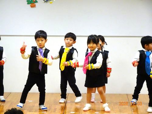 また、ダンスではもも1組、2組合同で『ミャクミャクのうた』、『ブラザービート』の曲に合わせて踊りました。初めての練習のときからノリノリで、早く発表会で保護者の皆さんの前で踊りたかったもも組さん。衣装を着て、にこにこ笑顔で踊ることができ、よく頑張りました。またひとつ成長できた機会となりました。