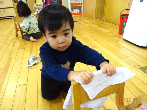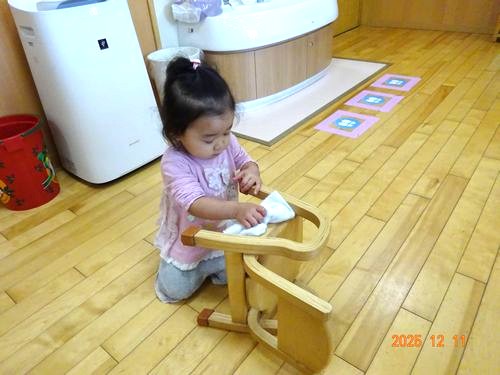 大掃除が始まると、保育室の壁や床、いすや机をきれいにしようと一生懸命取り組む園児たちの様子が見られました。たんぽぽ組(0歳児)やちゅーりっぷ組(1歳児)の園児たちは、お掃除ごっこを楽しみました。