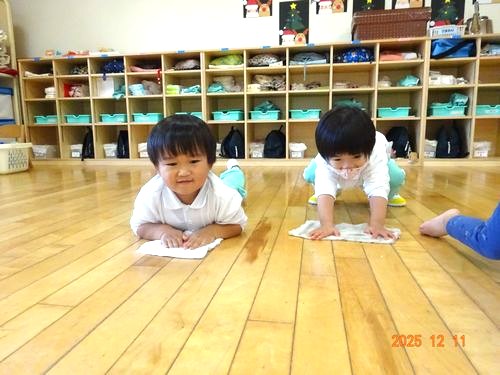 園児たちが今年1年の「ありがとう」の気持ちを込めて、それぞれの保育室や廊下、遊戯室などの掃除に取り組みました。ぞうきんをお家から持ってきた時から「お掃除したい!」や「拭き拭きしてきれいにする!」と言いながら楽しみにしていました。