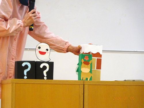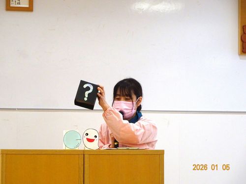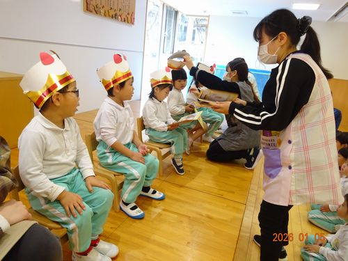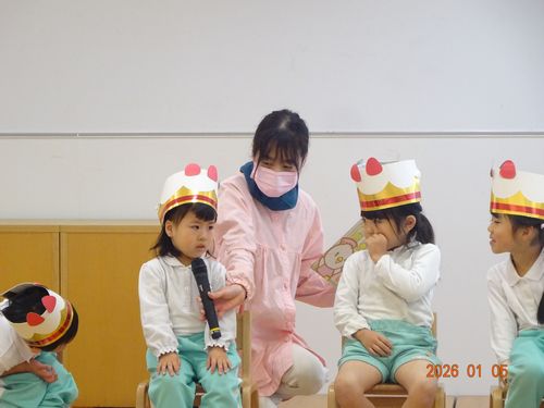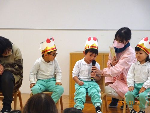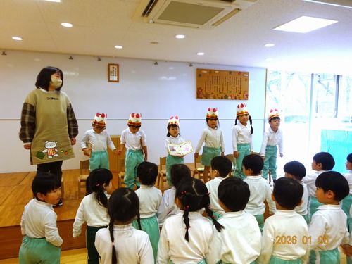 本日(1/5)、こども園の遊戯室で、インフルエンザの影響で延期になっていたこども園の満3~5歳児のクラスの誕生会を行いました。
