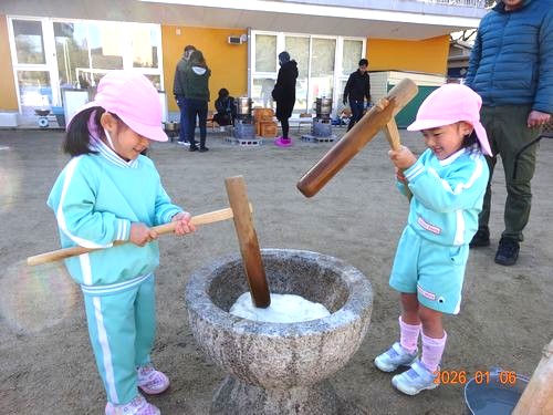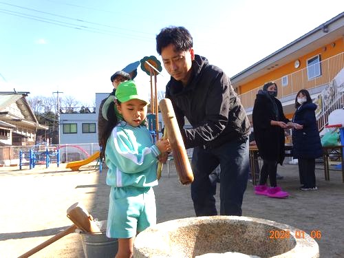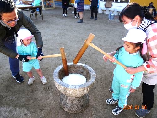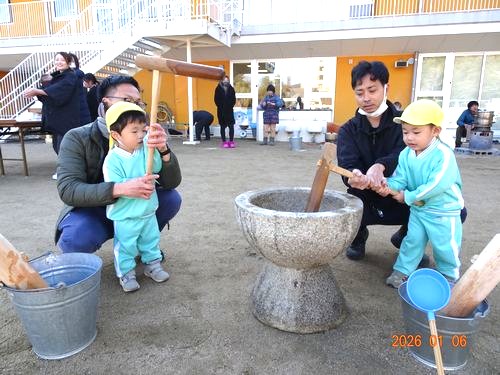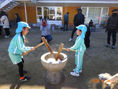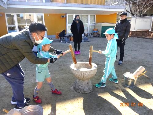 お手伝いしてくださった保護者の皆さんには、お世話になりました。ありがとうございました。園児たちが、がんばってついたお餅は持ち帰っていますので、ご家庭で喉に詰まらせないようご注意のうえ、おいしく頂いてくださいね。