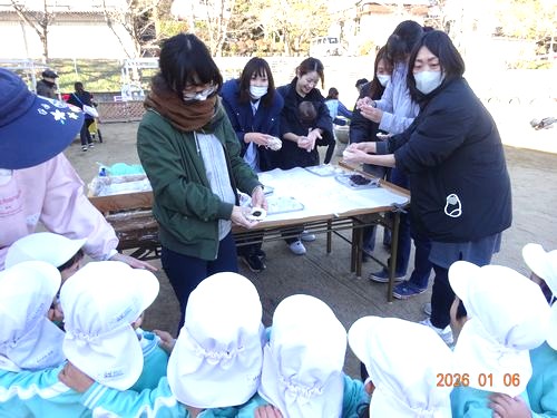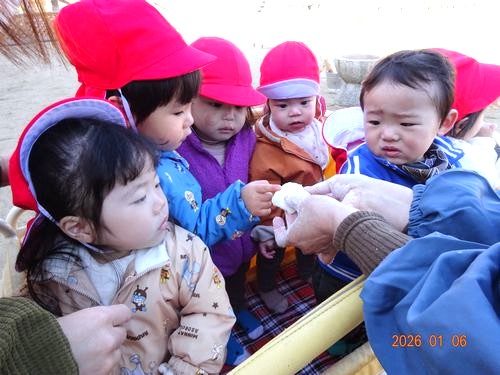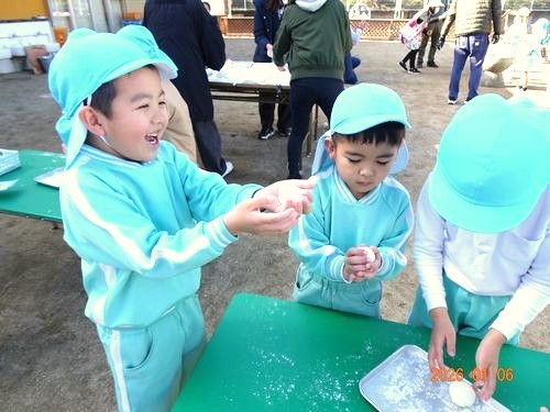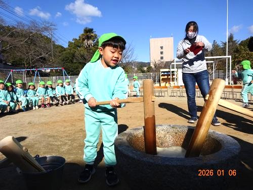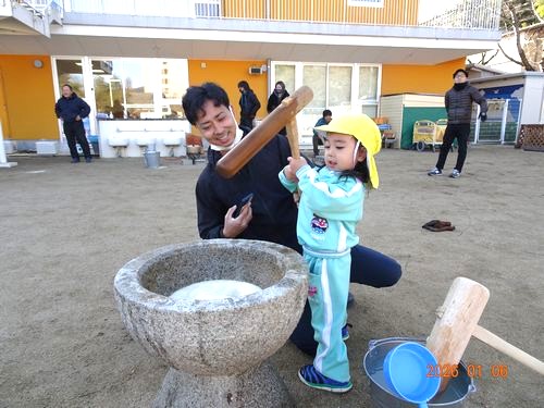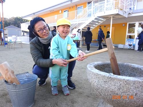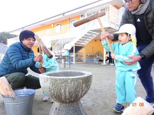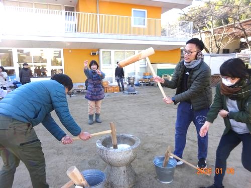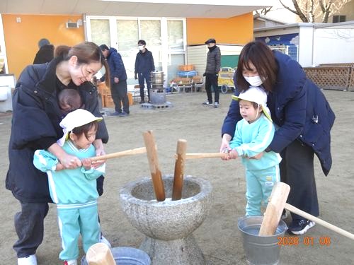 昨日(1/6)、こども園の園庭で、インフルエンザの影響で延期になっていた餅つきをしました。