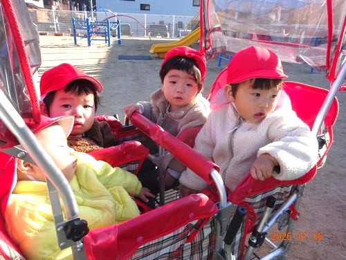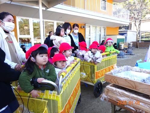 また、つきたてのお餅を触らせてもらい「温かい!」「ぷにぷにしてるね!」と嬉しそうな表情をみせてくれました。こども園と乳児保育園の0歳児と1歳児の園児たちは、ベビーカーやお散歩車に乗って、お兄さんやお姉さんたちが餅つきをしている姿を見つめていました。