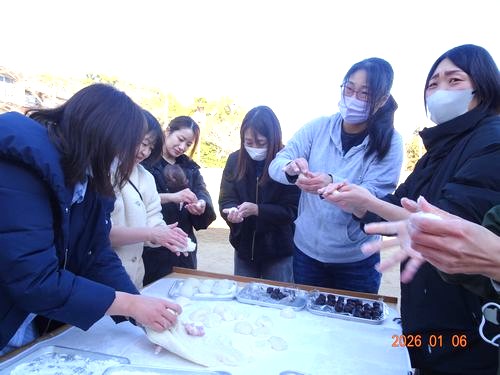 つき終わった餅は、お母さんたちが手際よく丸めてくださいました。また、うめ組(5歳児)の園児たちもお餅を楽しそうに丸める体験をしました。