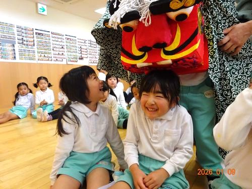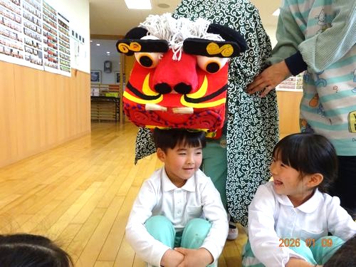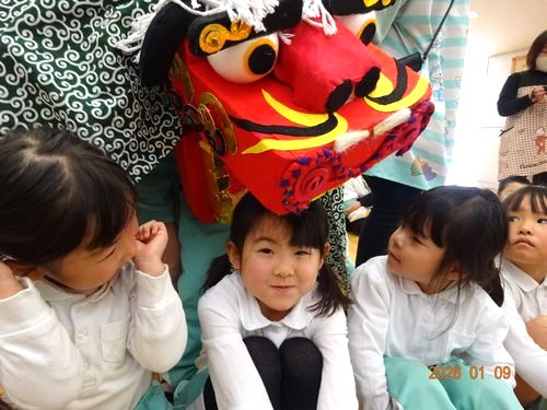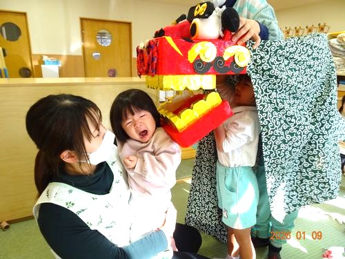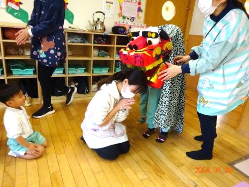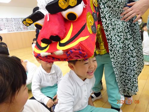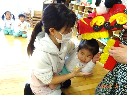 また、お獅子が登場し、園児たちや教職員の頭を噛んでもらいました。びっくりして泣いてしまう園児や、音楽に合わせてノリノリで手を叩きながら順番を待つ園児もいましが、頭を噛んで邪気を厄を払ってもらうことができました。