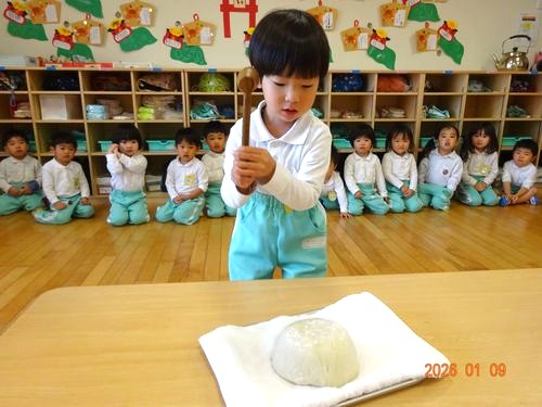 こもも組(満3歳児)以上の園児は、遊戯室に集まって、先生から鏡開きや鏡餅についてのお話しを聞いたり、絵本「おしょうがつのかみさま」を読んでもらいました。その後、園児たちは、今年一年の抱負を唱えながら、順番に鏡餅を木槌で叩きました。また、ひまわり組(2歳児)以下の園児たちは、それぞれの保育室で鏡餅を木槌で叩きました。