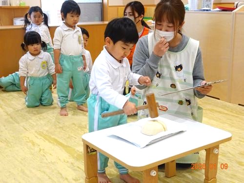 先生から鏡開きの行事や鏡餅についてのお話しを聞いたのち、園児たちは、それぞれに木槌で鏡餅を叩きました。