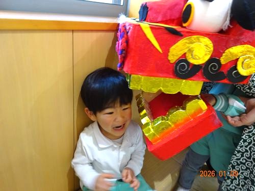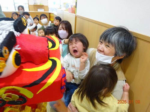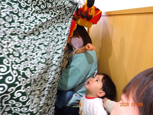 また、お獅子が登場し、園児たちの頭を噛んでもらいました。嬉しそうに噛んでもらう園児や、怖くて泣いてしまった園児もいましたが、「今年1年元気に過ごせますように」とお願いしました。