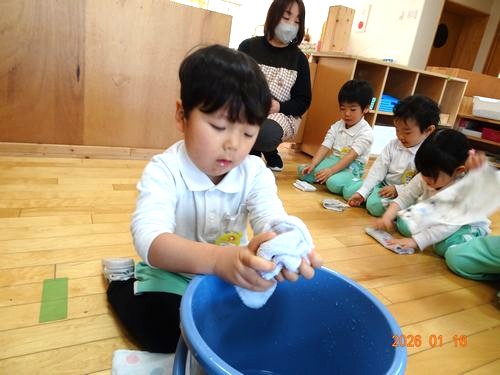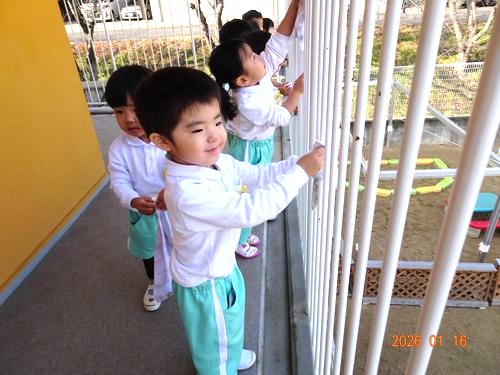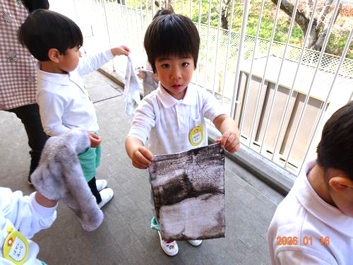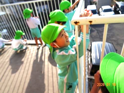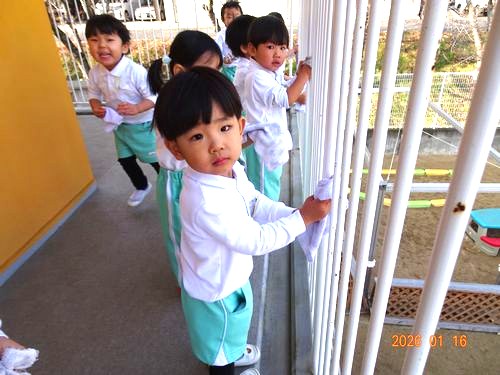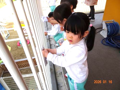 先日(1/16)、さくら組(4歳児)とこもも組(満3歳児)の園児たちが、こども園の園舎2階の屋外テラス掃除を行いました。