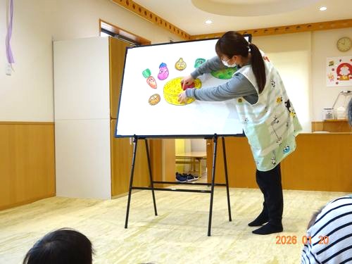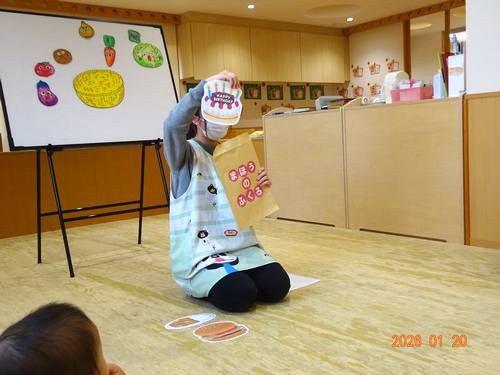 お楽しみのコーナーでは、「おしくらまんじゅう」のパネルシアターを見ました。寒い冬の日、野菜たちが集まって「おしくらまんじゅう」をして体を温めます。「おしくらまんじゅう、おされてなくな!」とみんなで声を出しながら、だんだん部屋の中もにぎやかに。その後は、まほうの袋というマジックも見ました。袋の中に具材を入れてみると……あら不思議!カレーやケーキなど、次々にいろいろな食べ物が出来上がって出てきます。「まほうの袋ってすごいね!」と楽しく終わることができました。