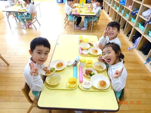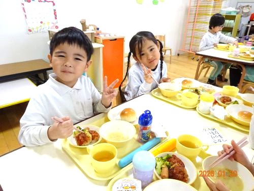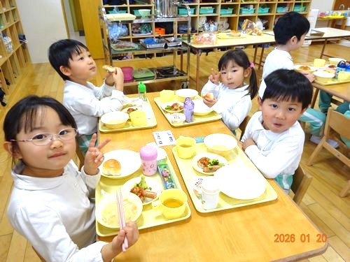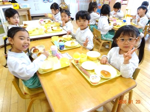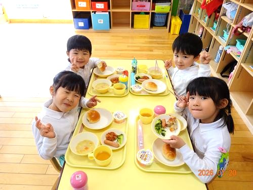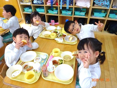 今日の給食は、豆腐ハンバーグ、ボイルウインナー、付け合わせ、クリームコーンスープ、パン、ゼリーでした。各クラスでお友だちのお祝いをしながらおいしくいただきました。