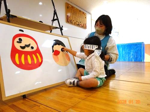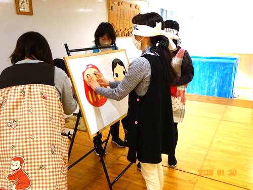 今月は、もも1組(3歳児)の園児が、司会をしたり、歌を歌ったりして会の進行をしてくれました。お楽しみのコーナーでは、今年も笑顔いっぱいに過ごすことができますようにと願いながら、大型の福笑いに挑戦。先生や代表のお友だちにより、たくさんの笑いで包まれました。