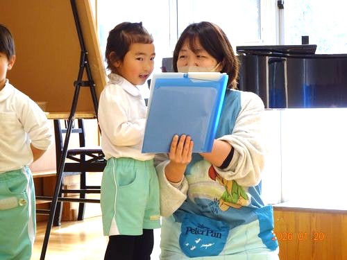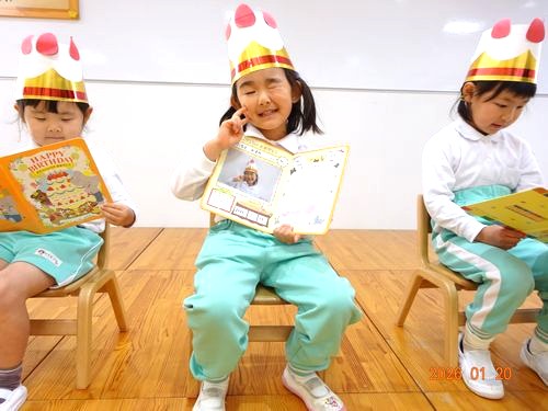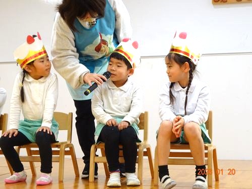 本日(1/20)、こども園の遊戯室で、1月生まれのお友だちの園児をお祝いをする誕生会を行いました。