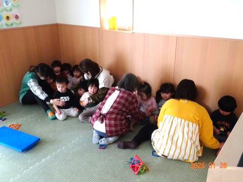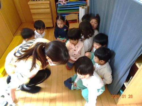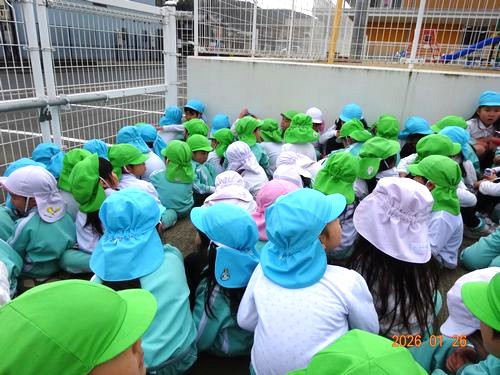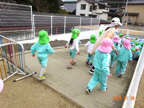 本日(1/26)、こども園の園庭に不審者が現れたという想定で、避難訓練を行いました。