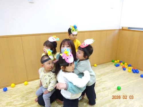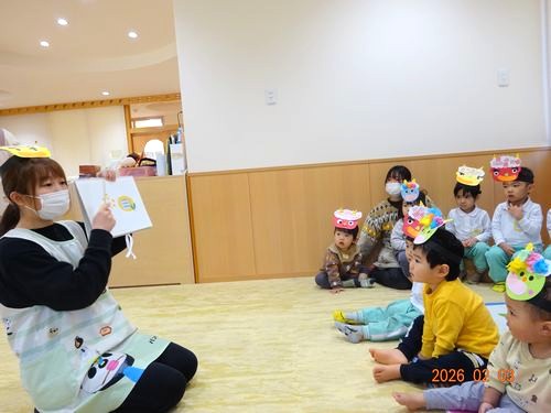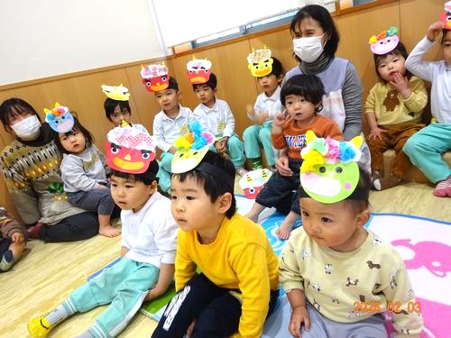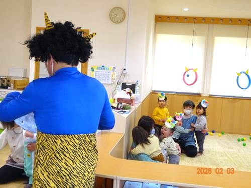 担当の先生から節分や豆まきについてのお話しをしてもらったり、自分の体の中にいる「泣き虫鬼」や「イヤイヤ鬼」を「おには〜そと!」と追い出したり、みんなで「おにのパンツ」と「豆まき」の手遊びをしたりしました。