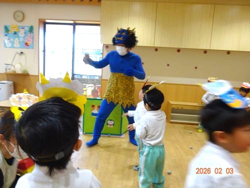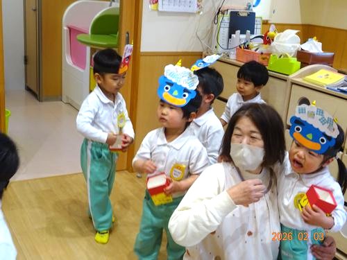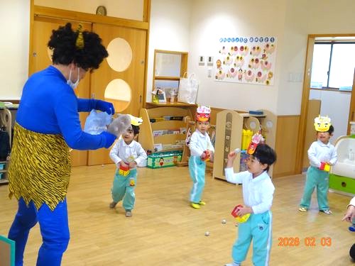 本日(2/3)、乳児保育園で節分・豆まきをしました。