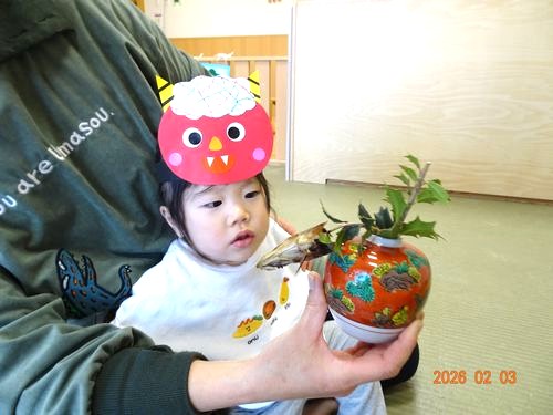 ひまわり組(2歳児)は、満3歳児以上のクラスの園児と一緒に遊戯室に集まり、担当の先生から節分とはどのような行事なのかをペープサートでお話ししてもらったり、ひいらぎいわしや恵方巻きについても教えてもらいました。