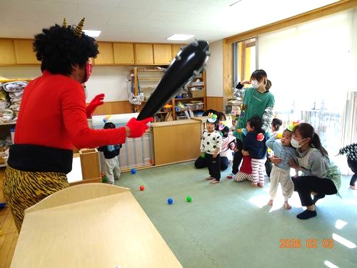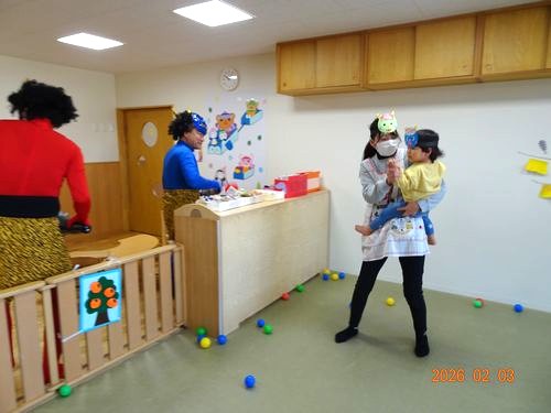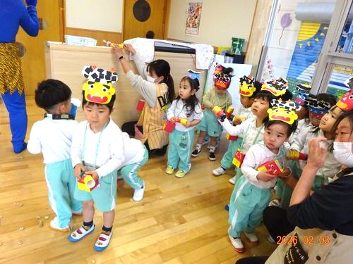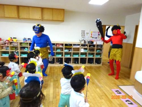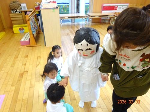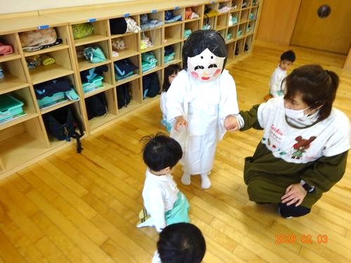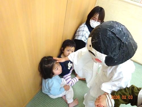 その後、保育室に戻り自分の体の中にいる「イヤイヤ鬼」や「泣きむし鬼」を「おには外〜!」と追い出しました。その後、それぞれの組の保育室に赤鬼と青鬼が登場し、泣き出してしまう園児や、先生の後ろに隠れる園児、鬼に立ち向かう園児などいろいろな姿が見られました。そして、「しあわせがいっぱい訪れますように」と福の神がやってきて、頭を撫でてもらいました。