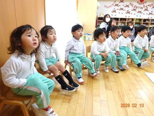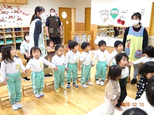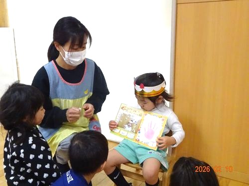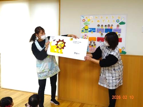 本日(2/10)、こども園のひまわり組(2歳児)保育室で、2月生まれのお友だちをお祝いをする誕生会を行いました。