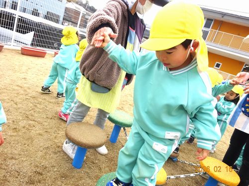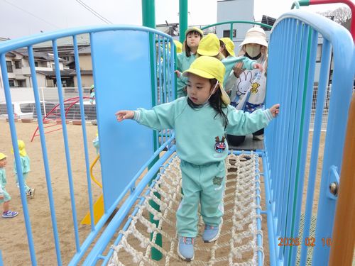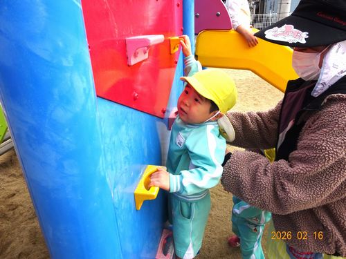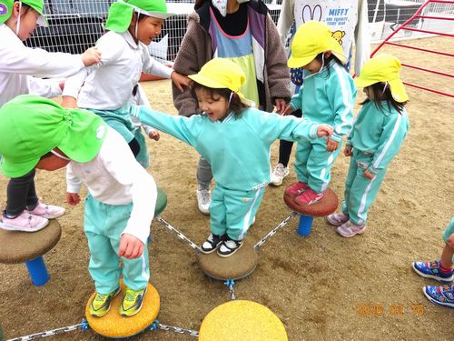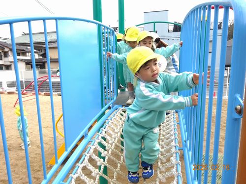 先日、ひまわり組(2歳児)の園児が全員誕生日を迎え3歳になり、園庭の大型遊具デビューをしました。