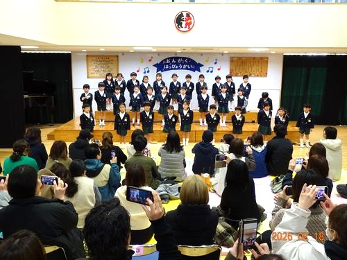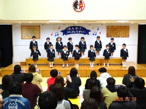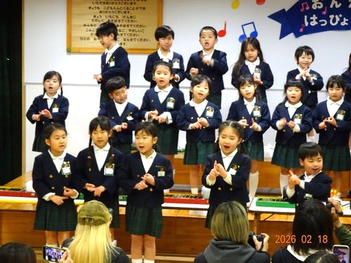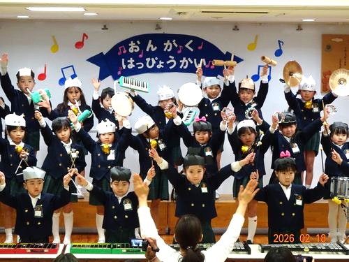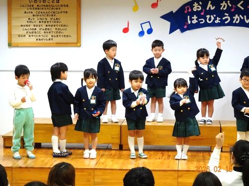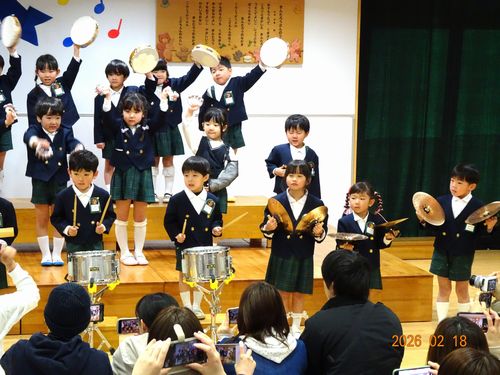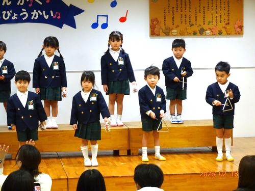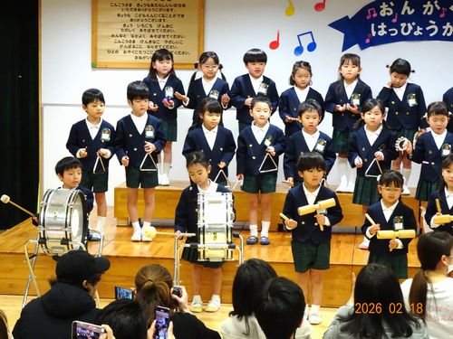 昨日(2/18)、こども園の遊戯室でもも1・2組、さくら組、うめ組(3~5歳児)の園児たちが、音楽発表会を行いました。