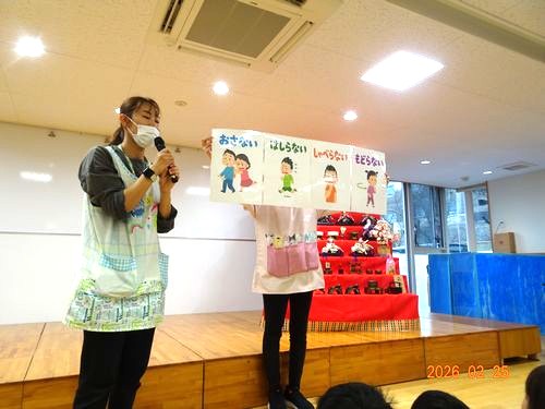 その後、担当の先生から、避難をするときのお約束の「おはしも」のお話し聞きました。園児たちは、改めて避難をする時のお約束を確認することができました。