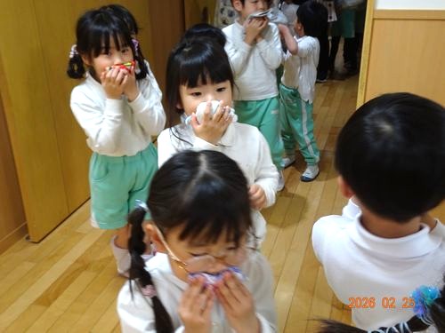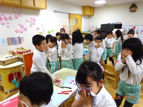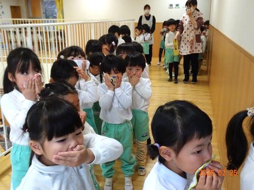 今回は、雨天のため、遊戯室に避難をしました。 避難をするときにハンカチを口に当てて避難する園児もおり、繰り返し訓練していることで避難の方法などを園児たちが身につけている様子が見られました。