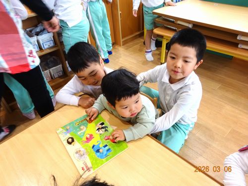 うめ組の園児は卒園まであとわずかとなりました。いろんなお友だちや先生と関って、園での楽しい思い出をつくっていけたらと思っています。また、来週も乳児保育園に行きたいなぁと、計画しています。