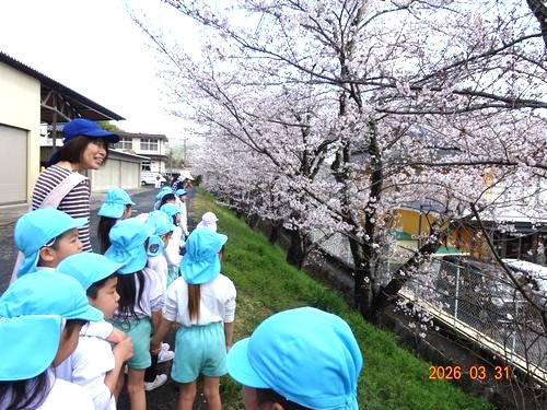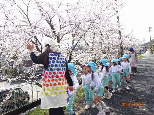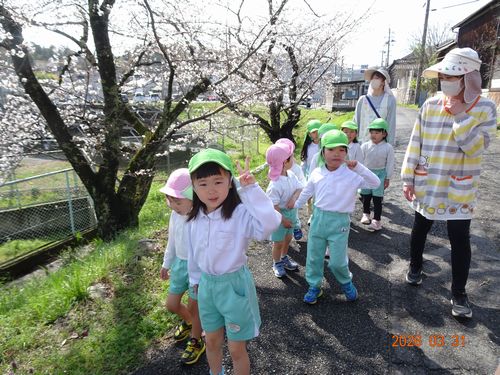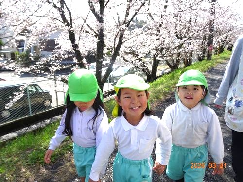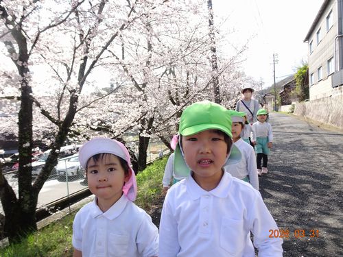 こども園は春休み中ですが、先日(3/31)に、こども園の3歳児以上の登園している園児たちが、お花見散歩に出かけました。