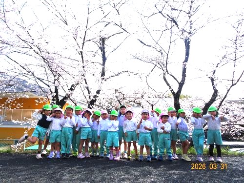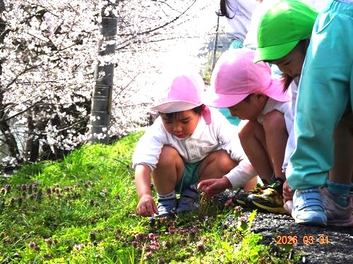 桜や野花が咲いていて、園児たちからは、「きれい~」と歓声があがっていました。 お花見をした後は、雨上がりの園庭で水溜まりの中に船を浮かべたり、山をつくったりして好きな遊びを楽しみました。 うめ組(5歳児)の園児たちは、最後の登園日で、素敵な思い出の1日となりました。 小学校に元気に通ってくださいね。 こども園から応援しています。