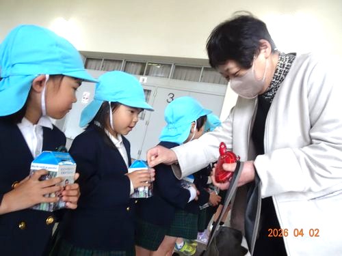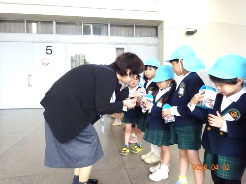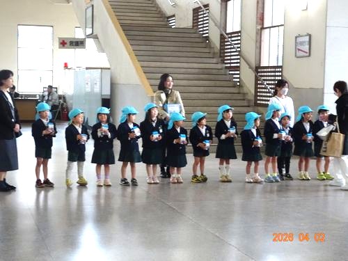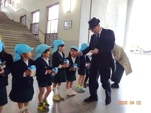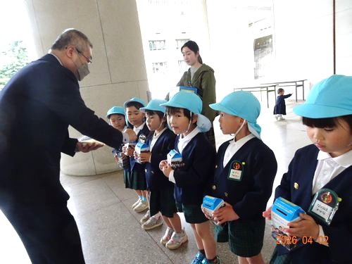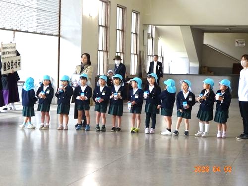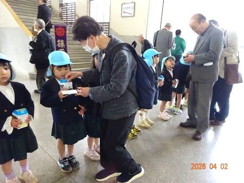 本日(4/2)、金光教本部で春の大祭が仕えられ、祭典前にうめ組(5歳児)の園児がKPAC(金光教平和活動センター)の募金活動に参加しました。